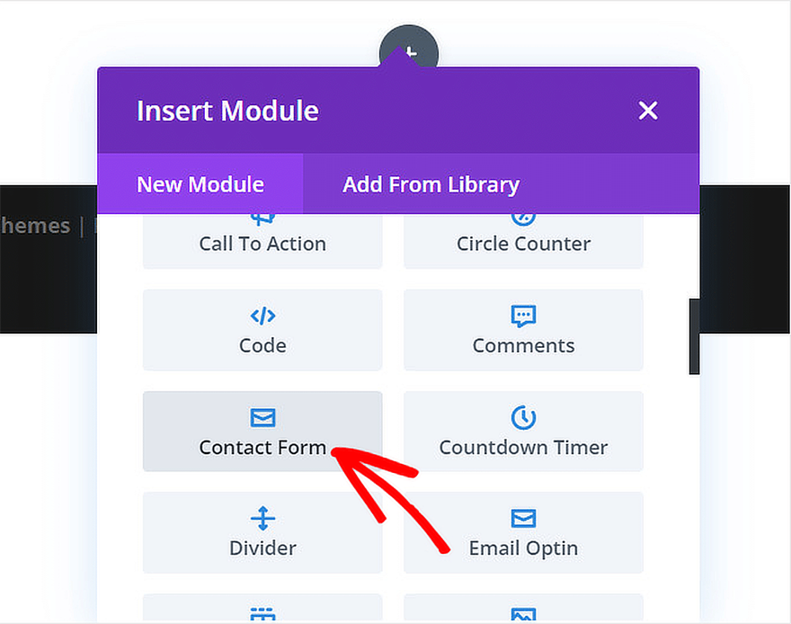 Inside the Divi Builder, click the plus icon to add a new module. Search for Contact Form and select the Contact Form module.