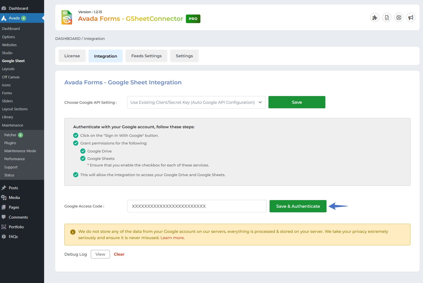 Now, you will be redirected back to the integration settings tab, where the authentication code will be displayed within the authentication text box. Please click on “Save * Authenticate” to proceed.