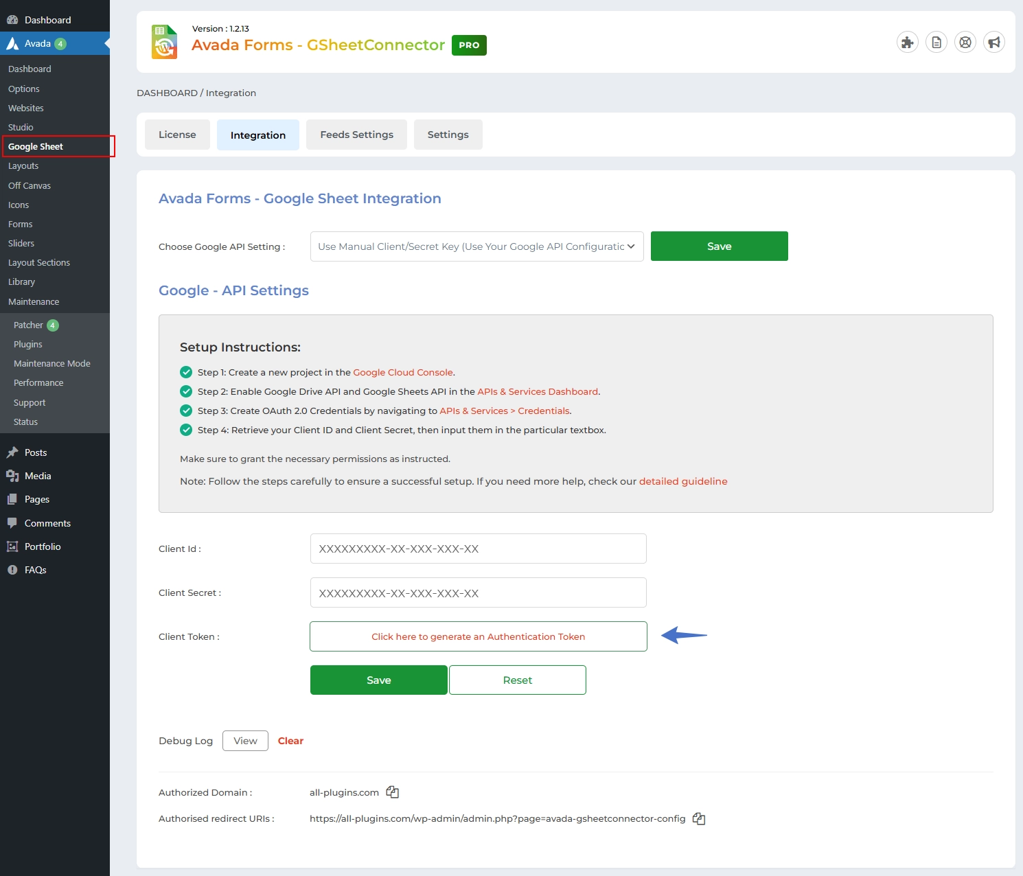 Enter the Client ID and Client Secret Key into the provided input boxes, and then click the Save button. Afterward, you’ll find a button that enables you to generate the Authentication Token, as per the below screenshot.