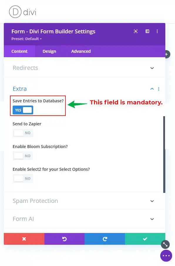 After adding fields, expand the extra toggle options. Find the “Save Entries to Database?” setting, and toggle it to “Yes”.