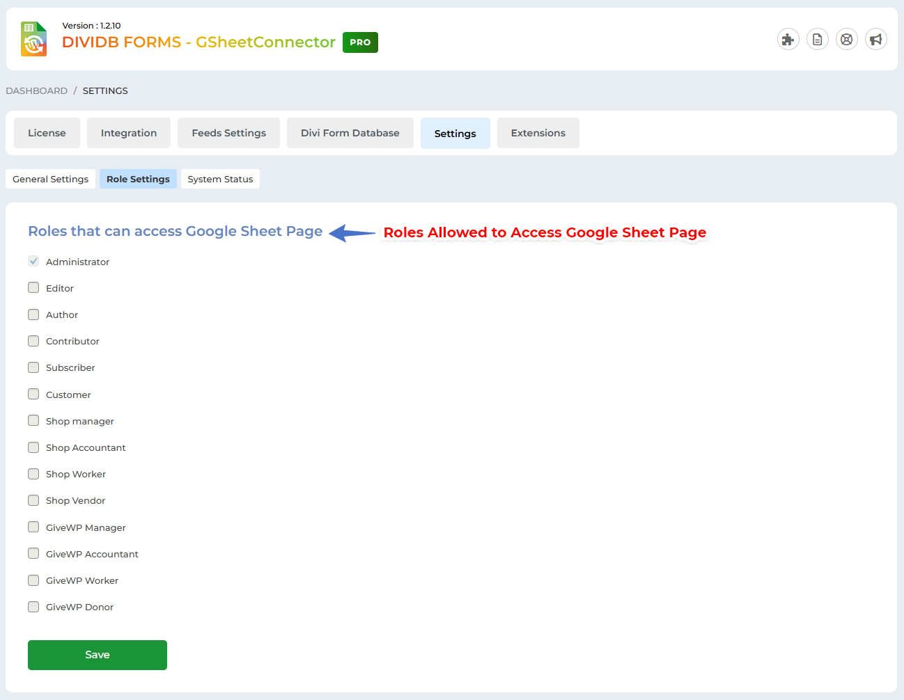 You can assign access to specific user roles (e.g., Administrator, Shop Manager). Only the selected roles will be able to view and interact with the GSheetConnector plugin tabs and settings.
