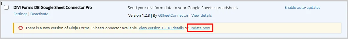 divi-db-gsheetconnector-pro-v1.2.8.zipfile from your computer. - Click Install Now to begin the installation process.