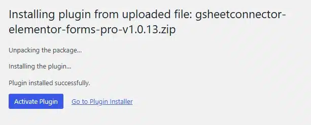 The Elementor Forms Google Sheet Connector Pro version is now installed and active, ready for configuration and use on your website.