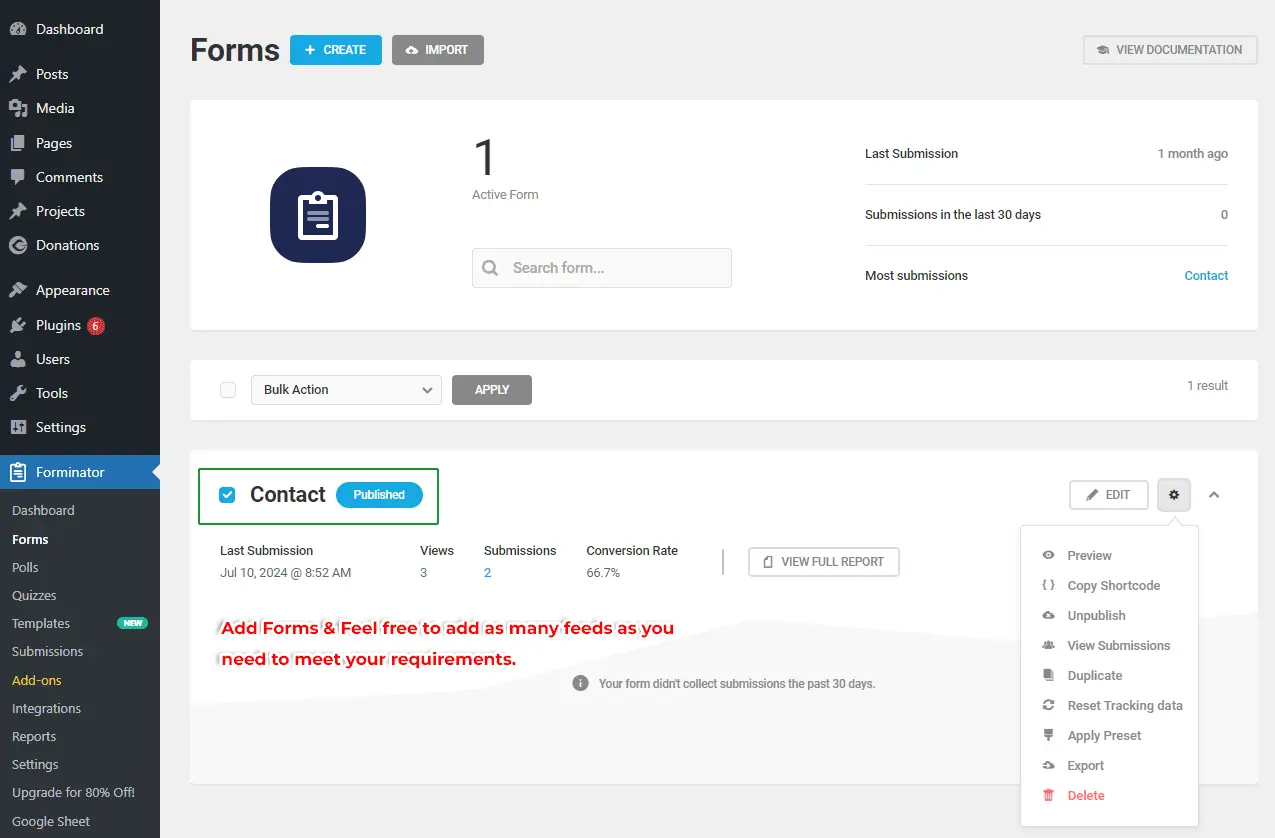 After successfully completing the integration with Google with preferred method and configuring the necessary permissions as described in the last article, proceed to your Forminator Forms dashboard. From there, locate and edit the specific Contact Form that you intend to configure for use with Google Sheets. This will allow you to set up the desired form-to-Google Sheets connection according to your requirements.