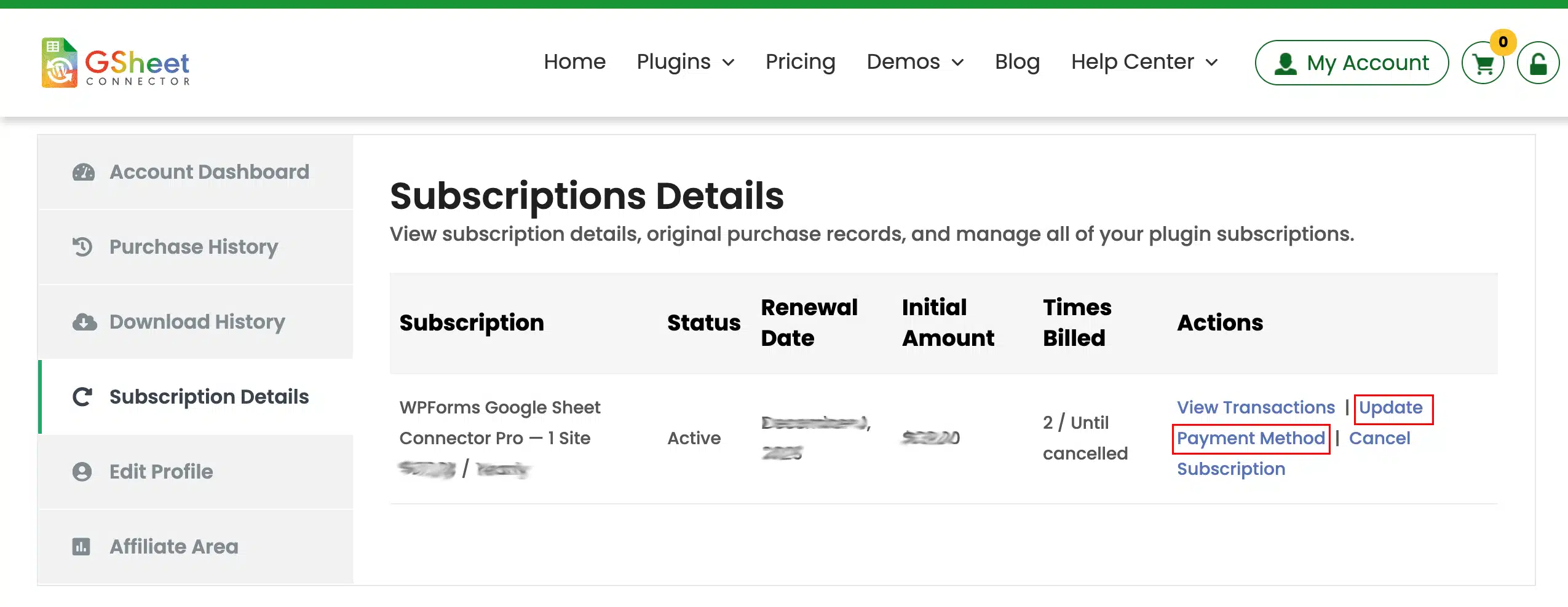You will see a link to update the payment method in the Action column on the right side of the table. Click on that link to proceed.