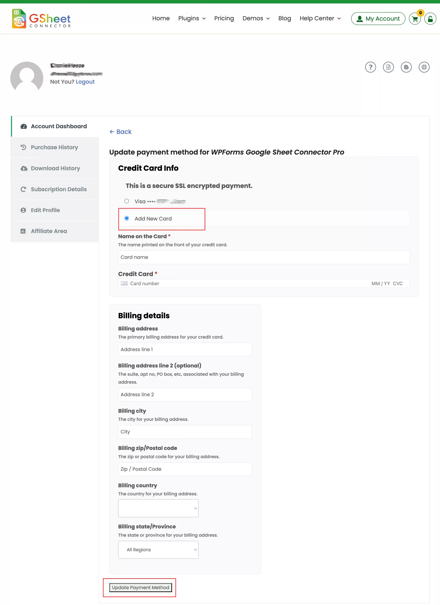When you go to Update Payment Method, you will find the Add New Card option under the Credit Card Info section. Click on it, then enter your new credit card details. Afterward, click the Update Payment Method button to save your new credit card information. This will ensure your new payment method is updated and available for future use.