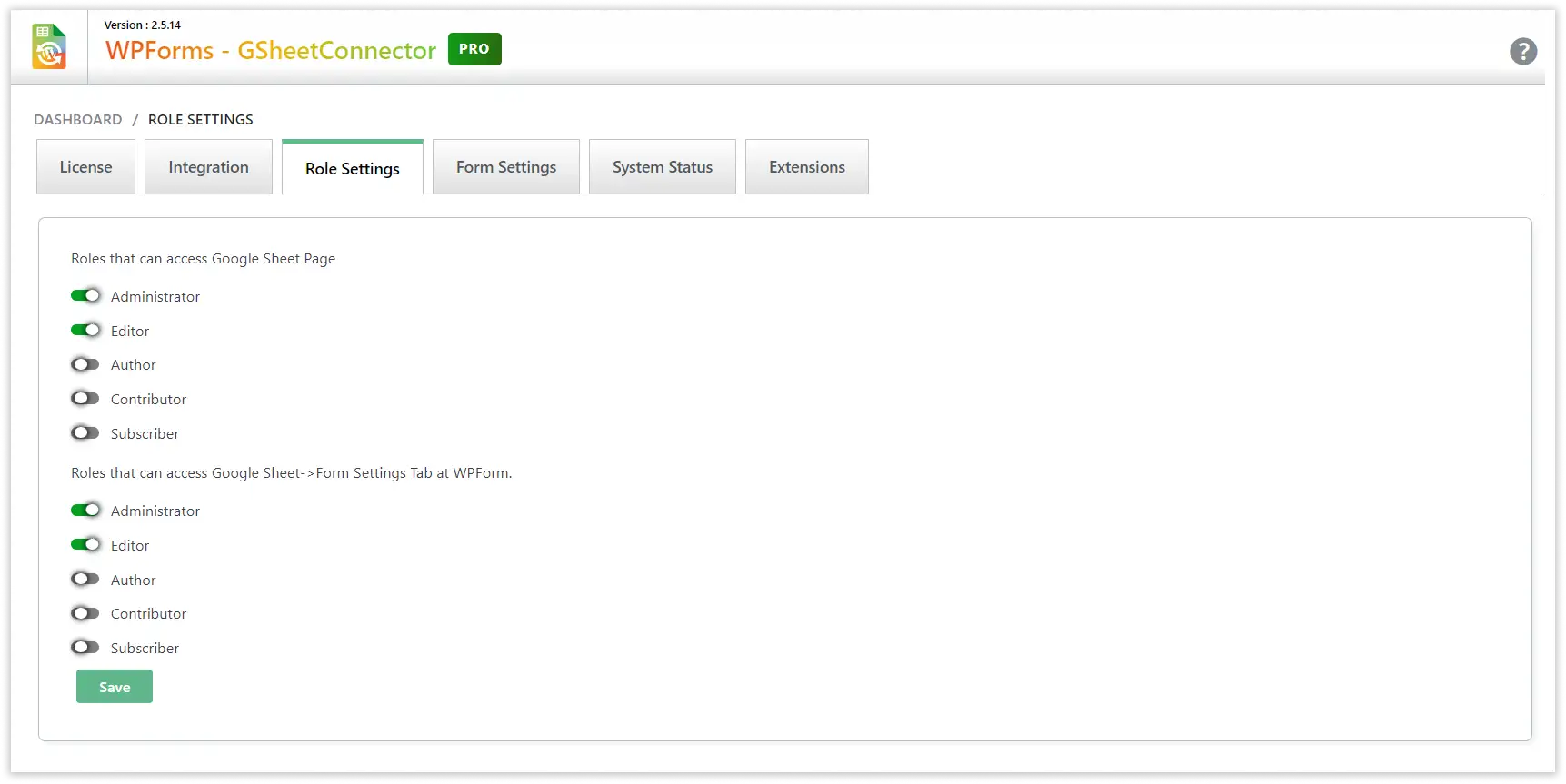 - Role Settings for editing the Google Sheet Settings of specific forms.”