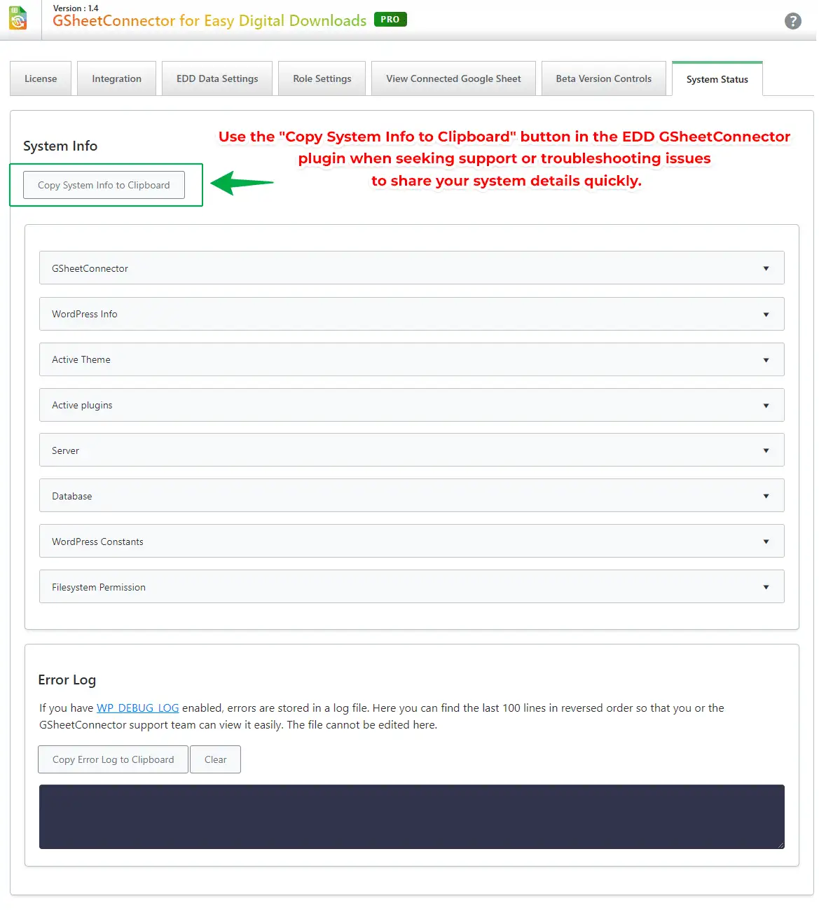 The content within the System Status section is primarily intended for reference purposes. Typically, you wouldn’t need to access or be concerned with this information unless you have a technical background or you are experiencing unexpected behavior with GSheetConnector on your website. In such instances, our support team may request information from this screen, along with additional details, to diagnose and resolve any issues efficiently.