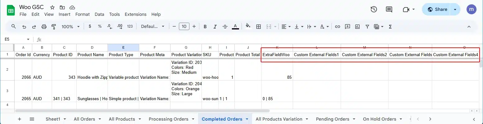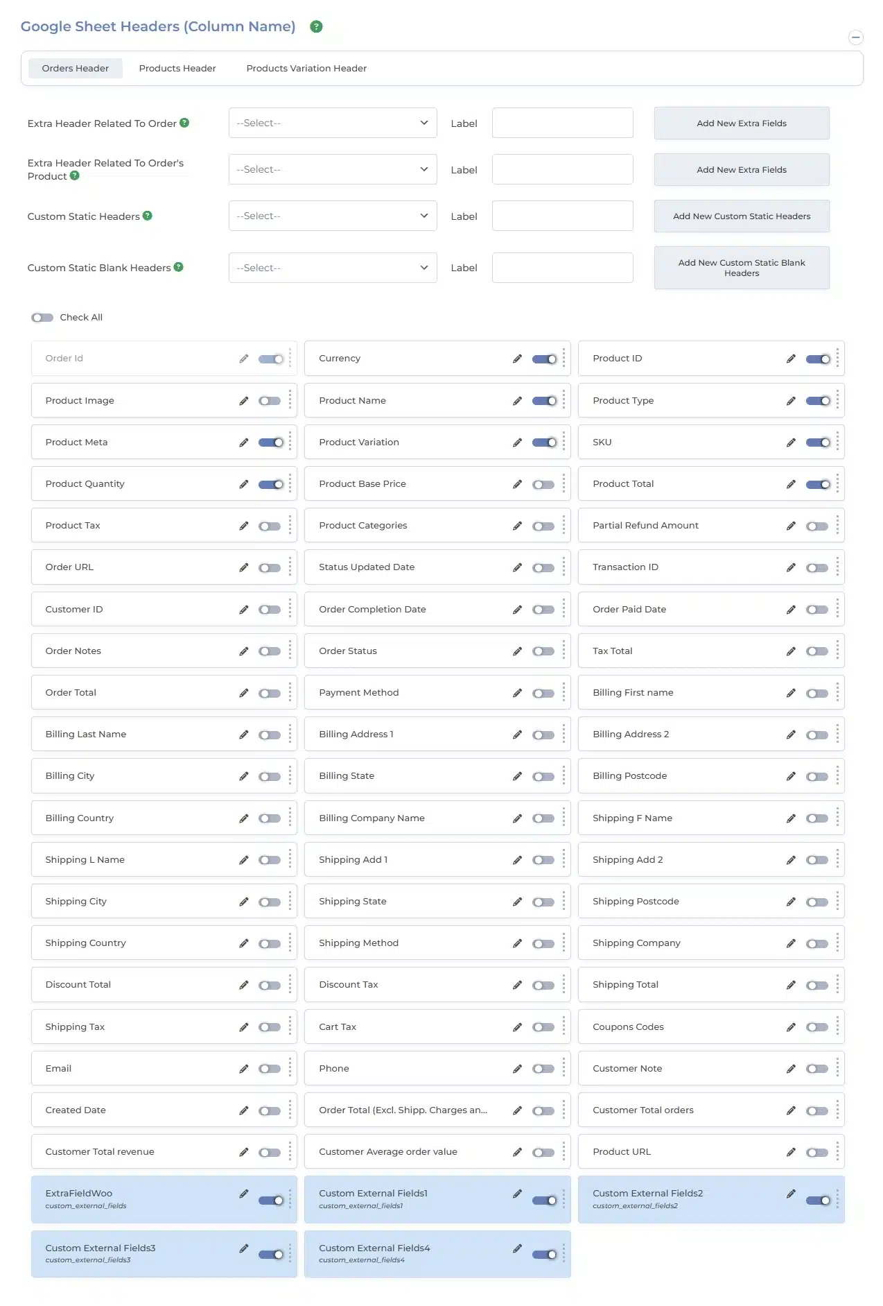 These headers become the column titles in your Google Sheet (like “ExtraFieldWoo”, “Custom External Fields1”, etc.).