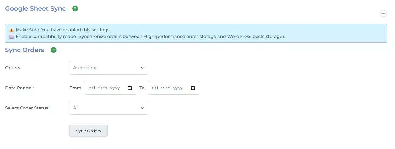 Once you save the Feed Settings, the Sync Orders section will appear. From there, you’ll be able to sync your WooCommerce products to your connected Google Sheet with ease.