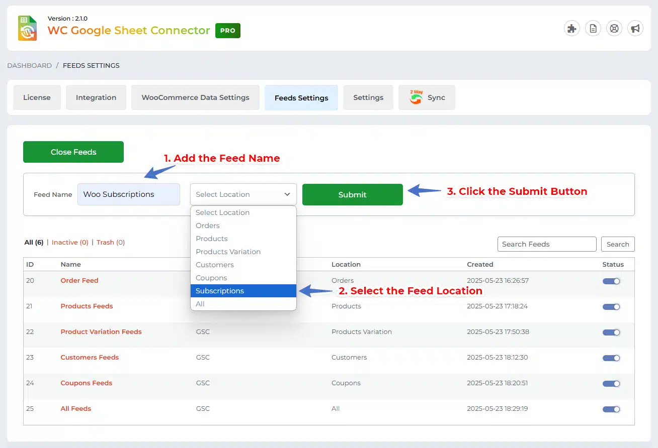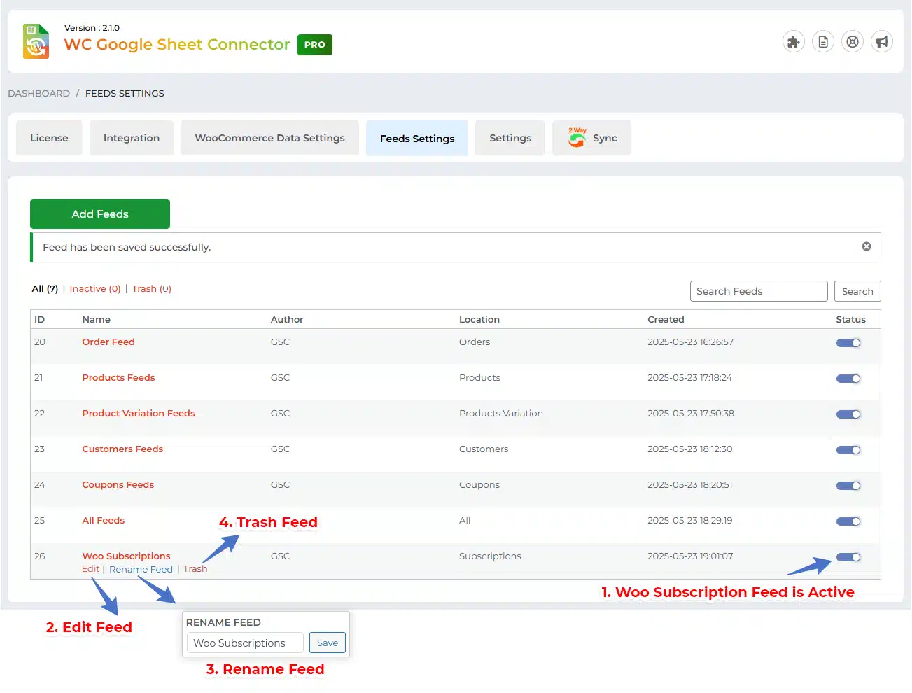 To activate the WooCommerce Subscriptions option in Feed Settings, follow these steps: