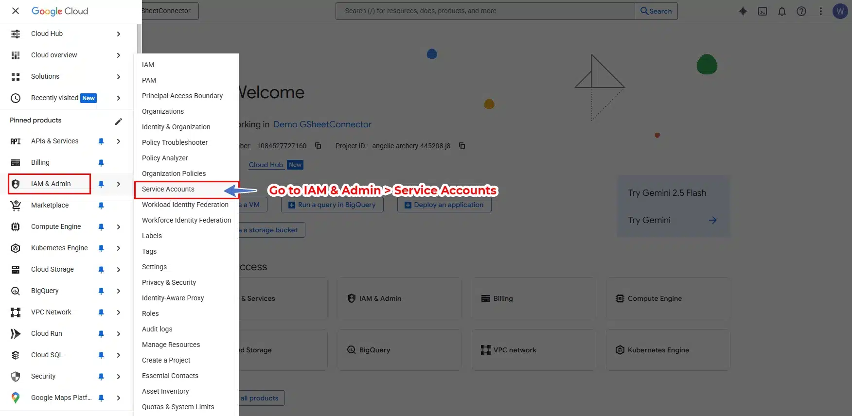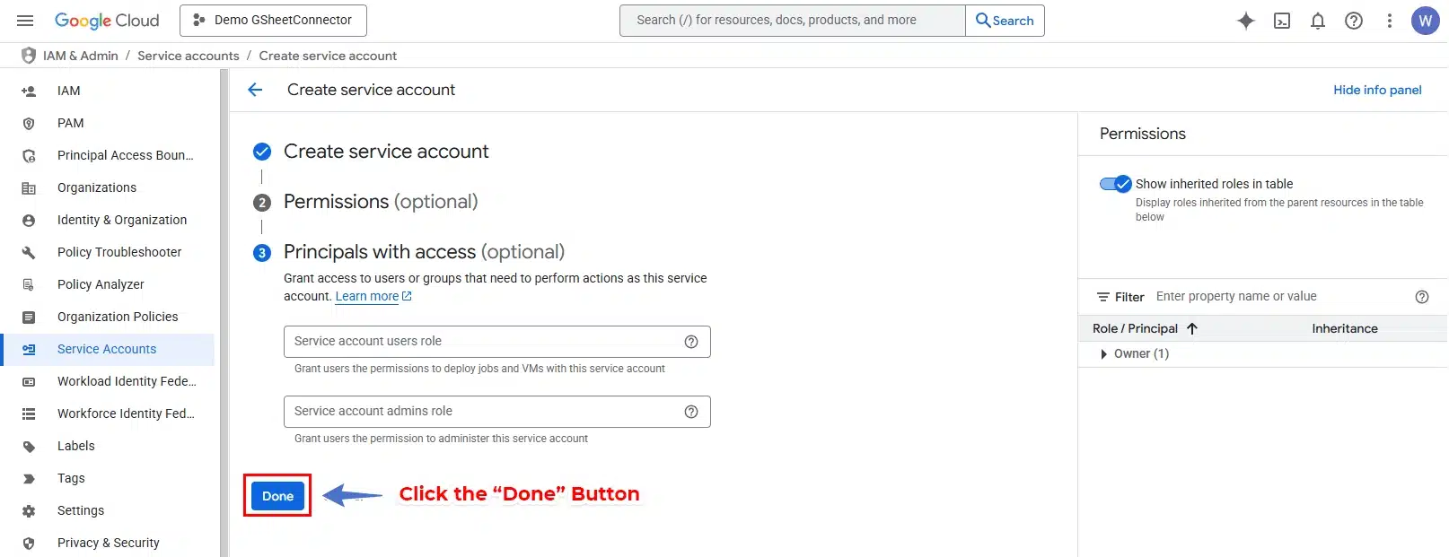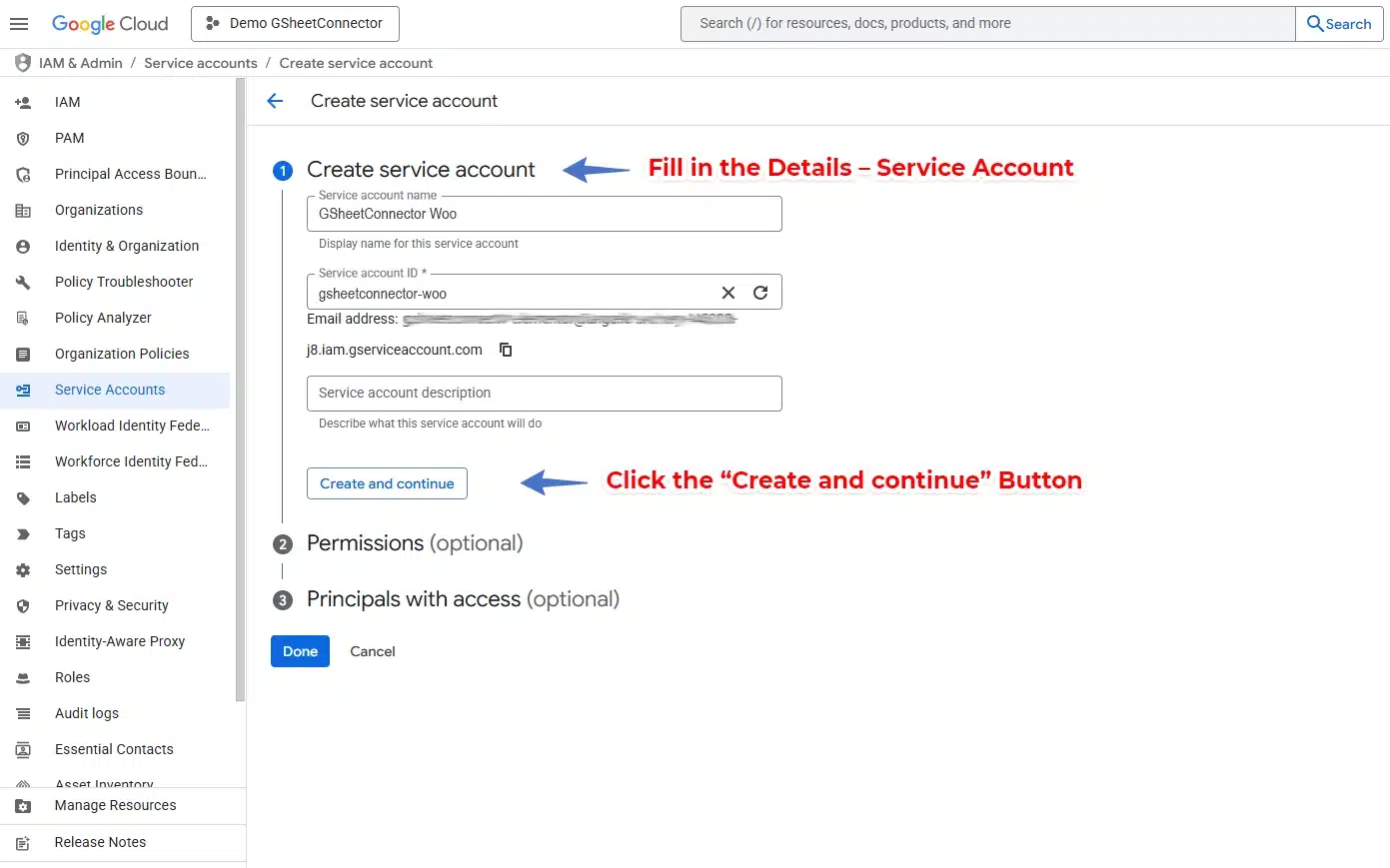 Once your service account is created, you need to provide Google Drive API and Google Sheets API permissions.