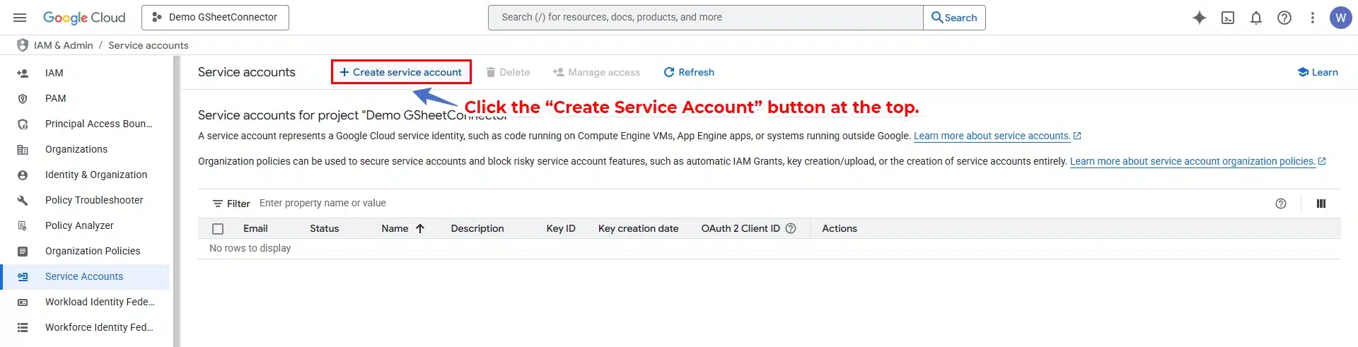 Click the “+ CREATE SERVICE ACCOUNT” button at the top.