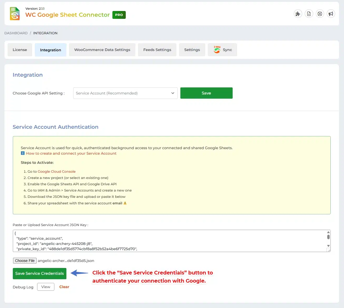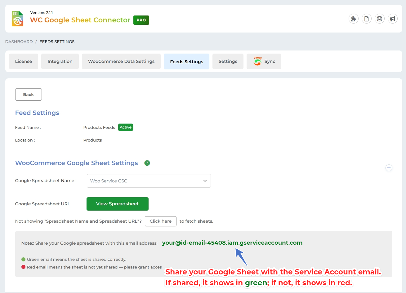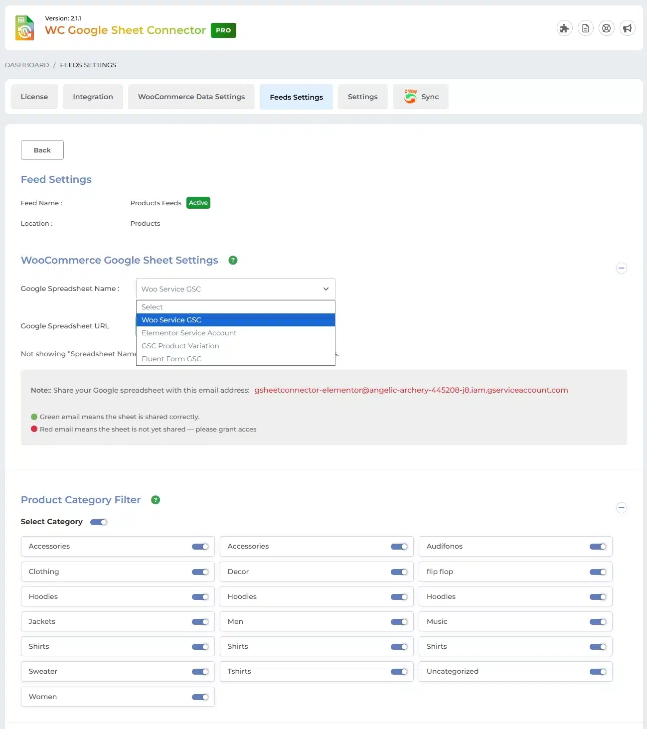 In Feed Settings, whether you choose Auto or Manual, first share your Google Sheet Settings with your Service Account email ID. After saving the Feed Settings, a label will appear in your sheet, and your Service Account email ID will be displayed in green at the top of the Google Sheet Settings section.