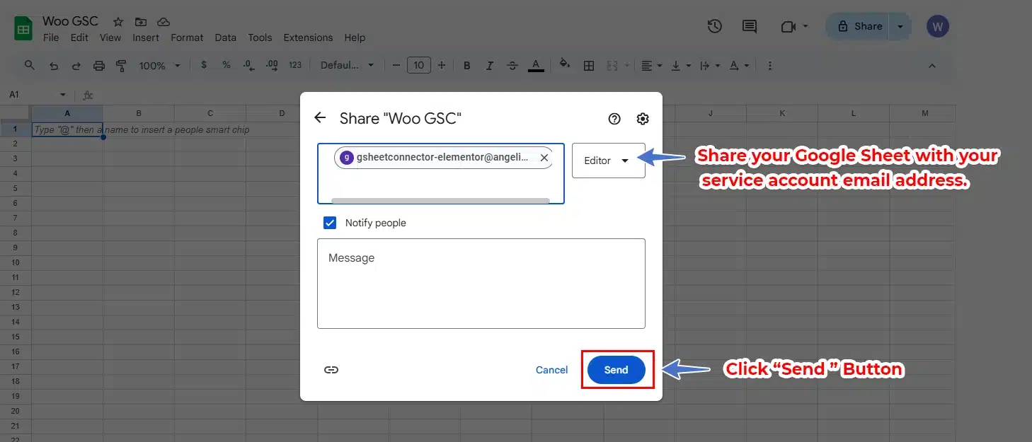 Share the newly created sheet with your Service Account email ID (the one you connected in the plugin). (e.g.,