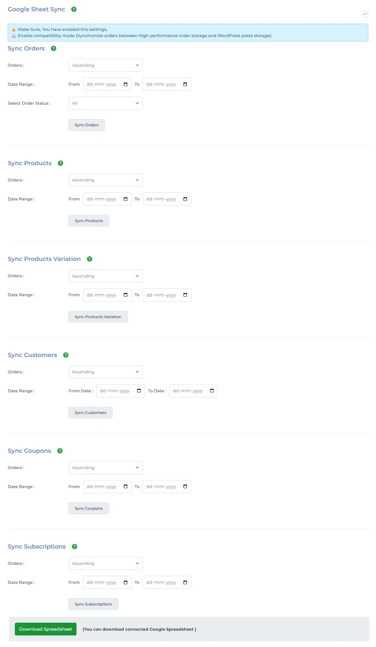 You can choose whether to manage Google Spreadsheets Order-Category wise.
