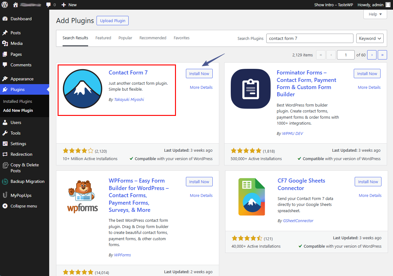 - Search for “Contact Form 7” in the search bar.