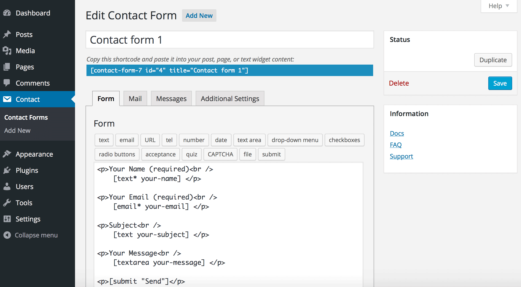 - After activation, you’ll see a new menu item called Contact in your WordPress dashboard.