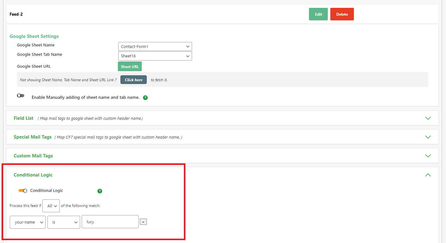 For both Single and Multisheet Connections, you have the ability to add conditional logic to your Contact Form. This means you can set up specific conditions that determine how and where the data from the form is saved in the connected Google Sheets. Refer the screenshot below,