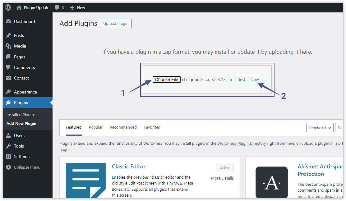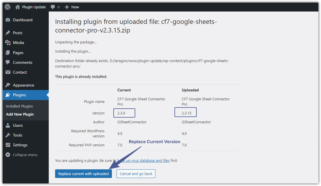 Note: The above option only shows if you have WordPress 5.5 or above. If you are using an older WordPress version, you must delete CF7 Google Sheet Connector and upload an updated version. Deleting the plugin will not remove any data as the data is stored in the DB, and installing an updated version will bring back the data. Either you can manage to upload the plugin from file manager or a cPanel